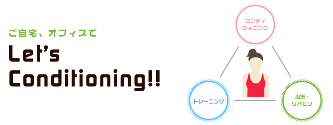 当院では、ご自宅・オフィス・スポーツ現場等ご希望の場所でコンディショニング、治療・リハビリ、トレーニングを含めたtotal Conditioningをお受け頂けます。